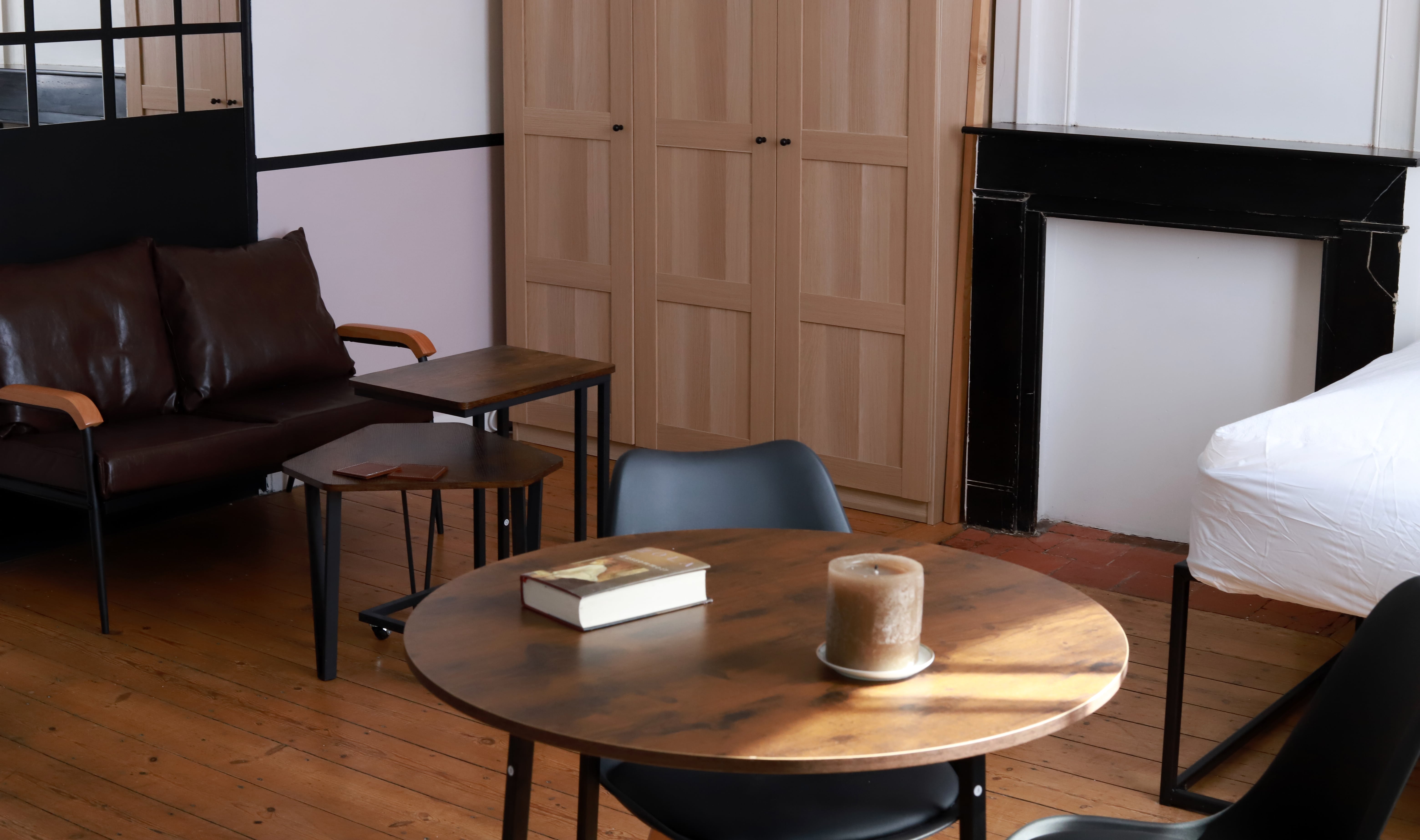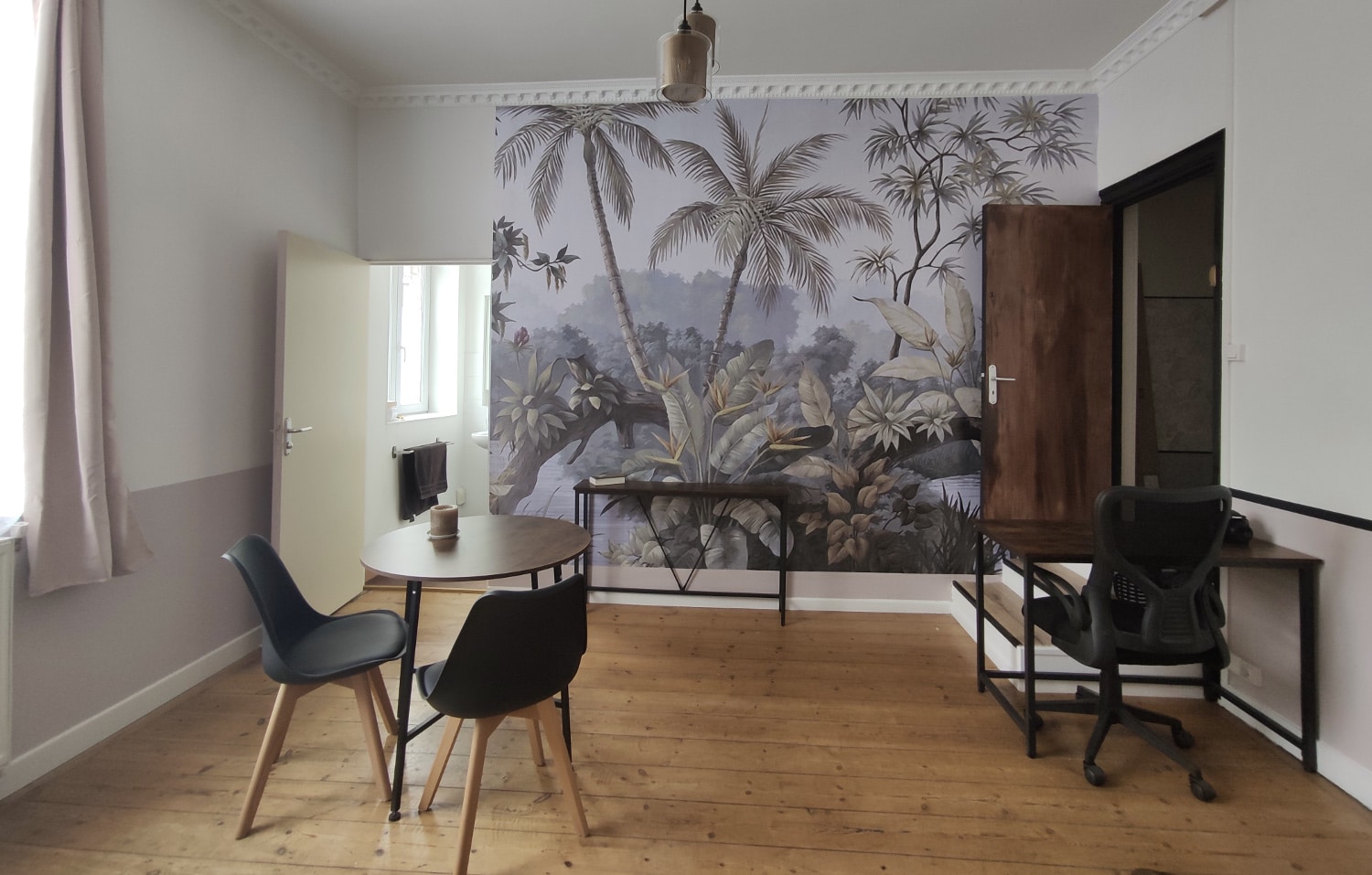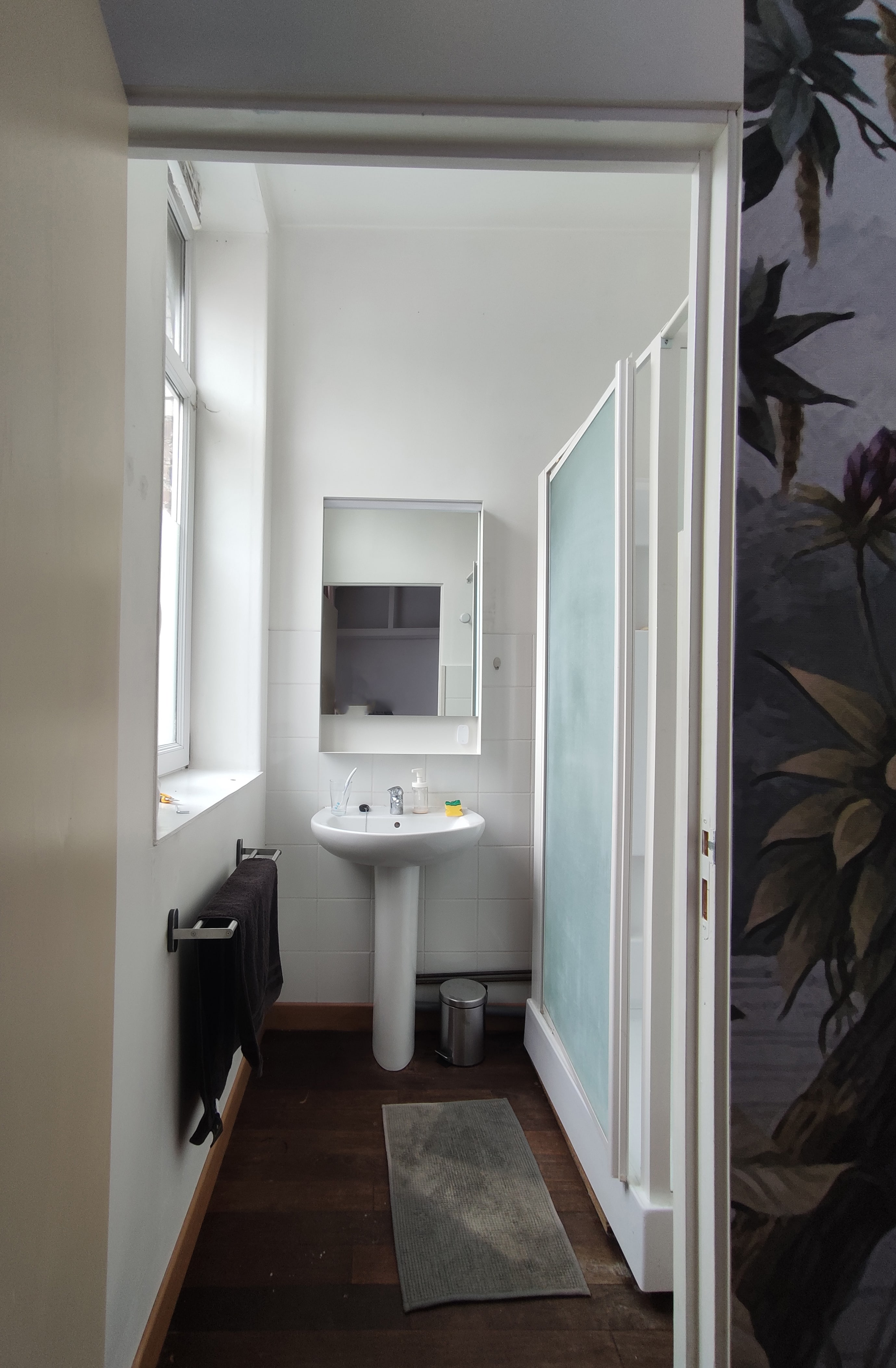 La chambre se trouve au 1er étage sur rue. Elle est entièrement équipée et décorée en style industriel. Elle dispose d'une salle de douche privative attenante qui se compose d'un lavabo et d'une douche